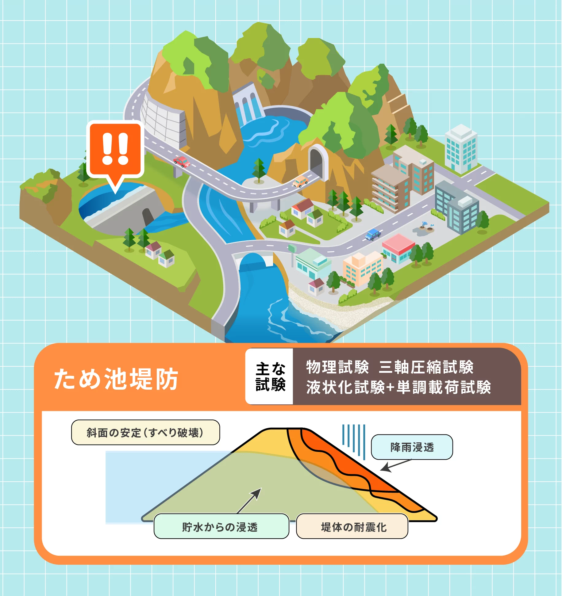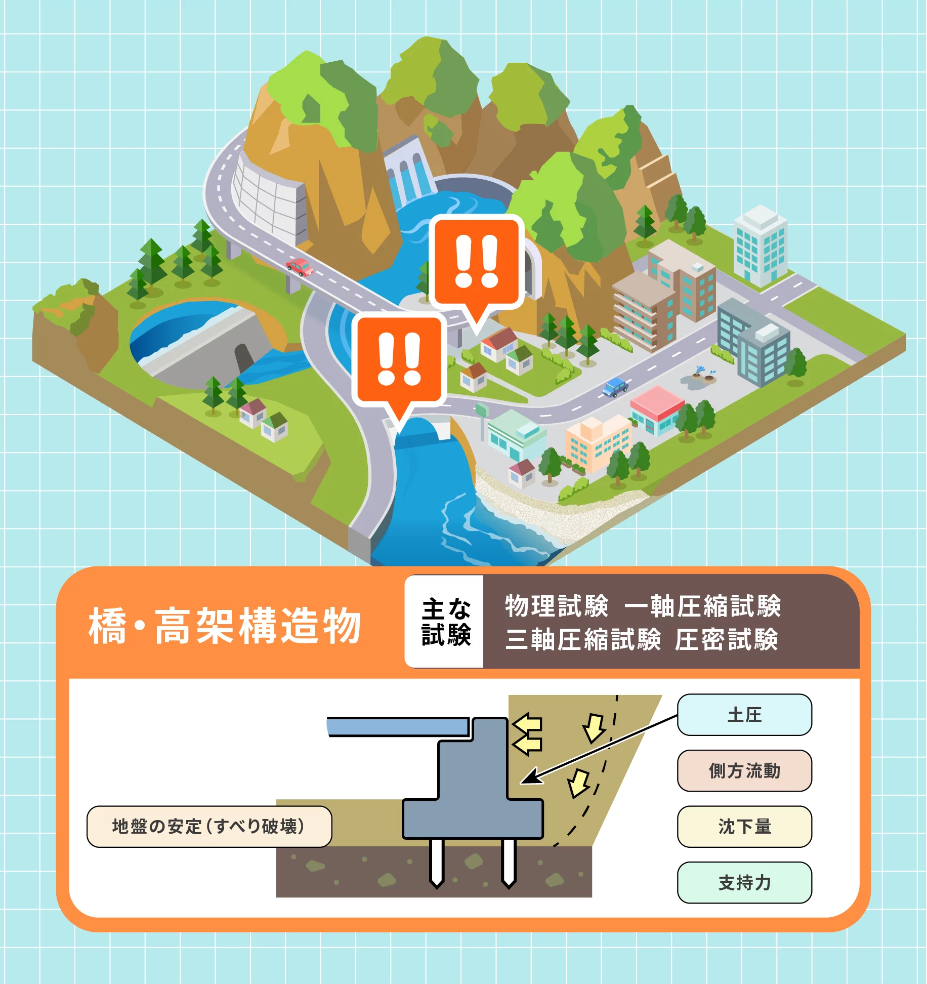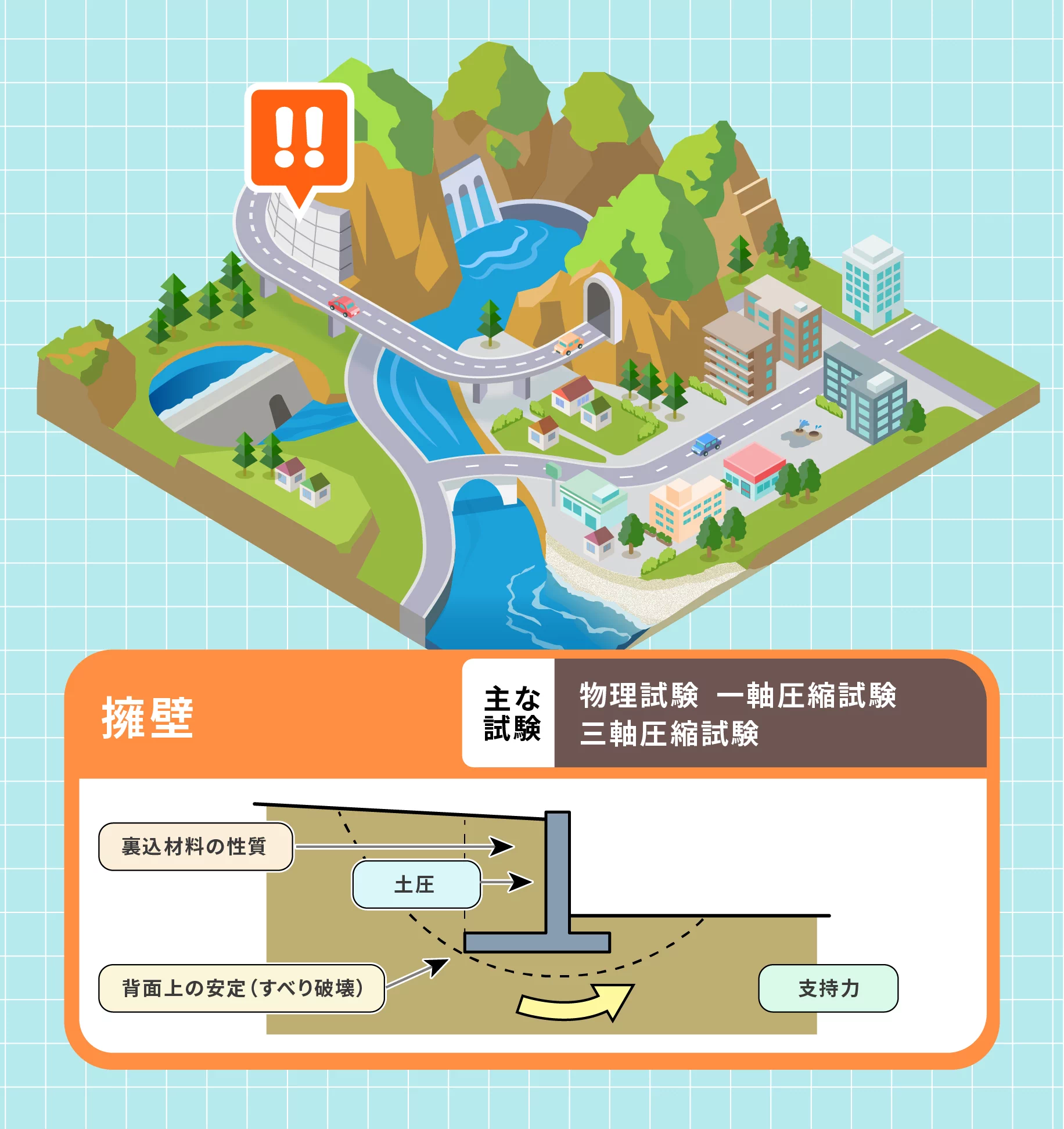 構造物や地盤は劣化や経年変化が生じます。対策の検討のために地盤材料試験が必要となる事があります。