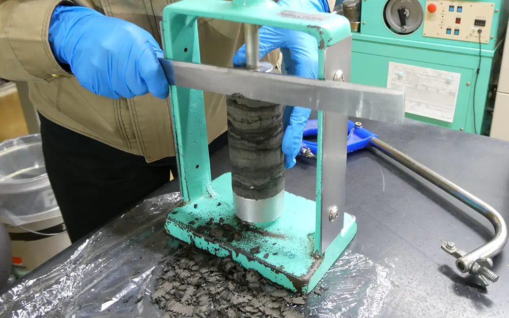 チューブと接触して乱された可能性がある周面を取り除いて中心の状態の良い部分だけで試験するために、トリマーに試料を設置して外側を削ります。台座は回転するので、ガイドに沿って削ると円柱供試体となります。