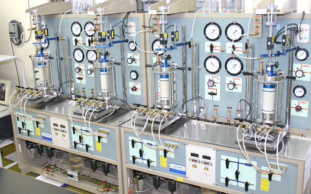 背圧を設定の大きさまでゆっくり加圧します。背圧によって気泡を溶解させて飽和度を高めます。この試験装置はセル単位で独立して運用しており、各セルでセンサー値をモニターしながら試験を進めています。もし、どれかの供試体で異常が発生した場合は自動で制御停止するとともに、他のセルは影響を受けずに試験を完遂します。