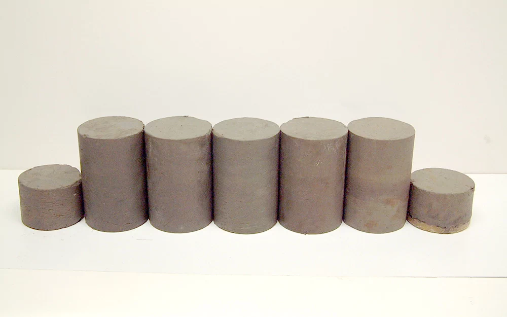 三軸圧力室を解体し、供試体を取り出します。供試体はせん断によって変形し、おおよそ斜め方向にせん断面を形成しますが、軟弱な沖積土では”たる形”変形となってせん断面が見られないことも多いです。
