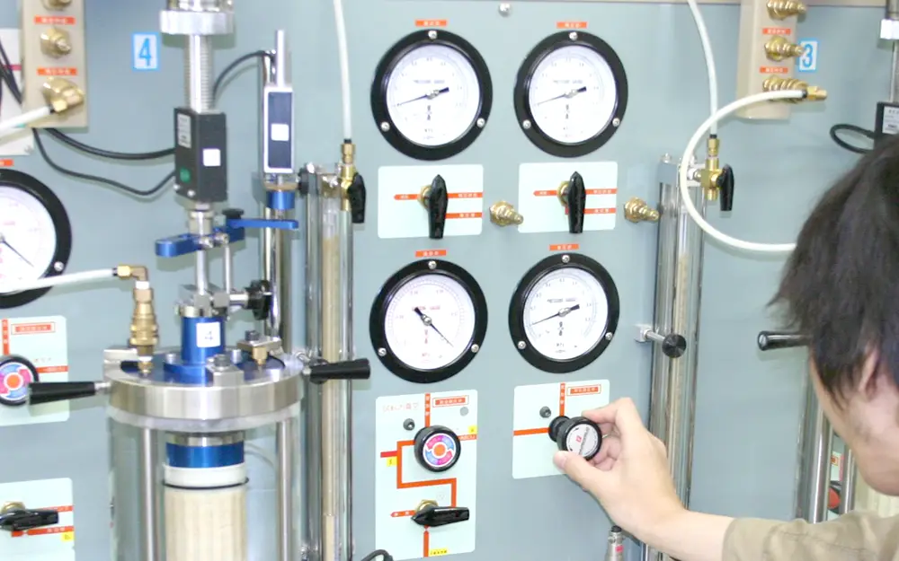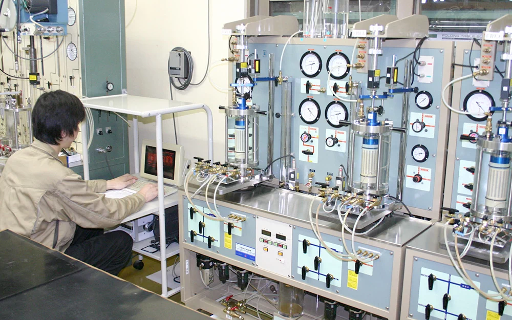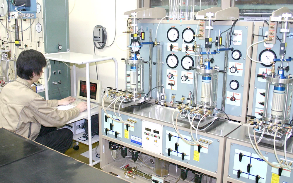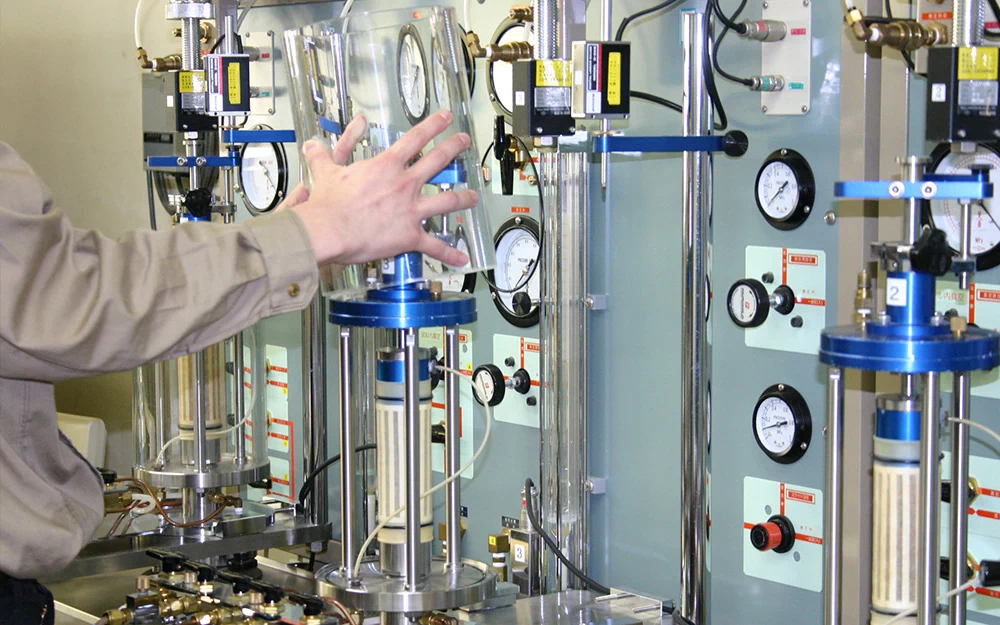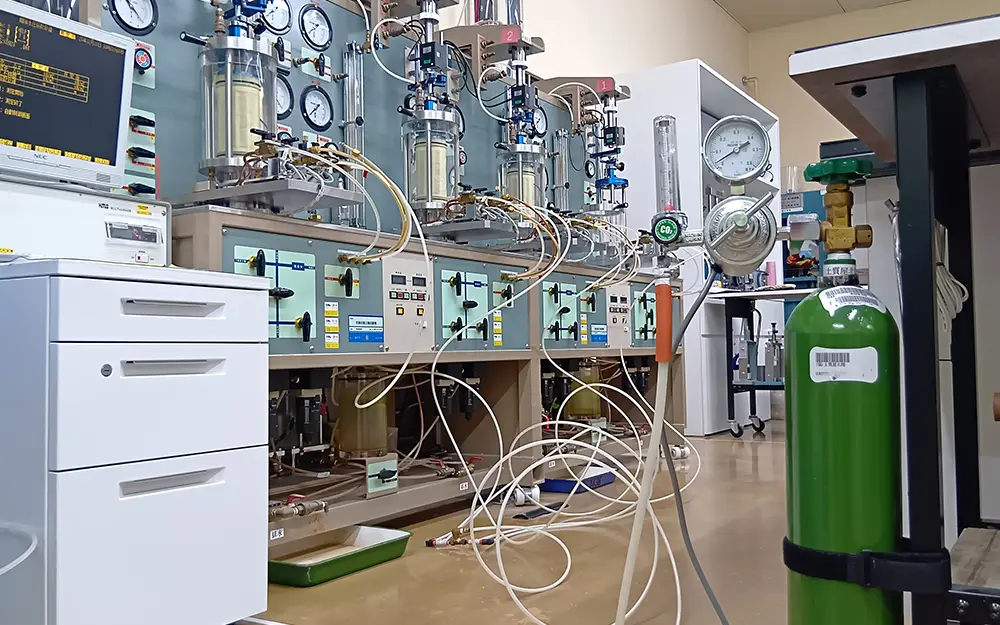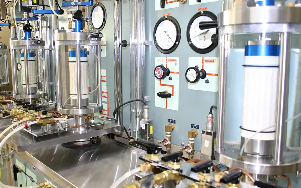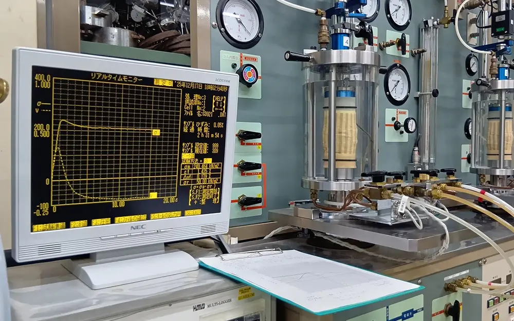 背圧を設定の大きさまでゆっくり加圧します。背圧によって気泡を溶解させて飽和度を高めます。この試験装置はセル単位で独立して運用しており、各セルでセンサー値をモニターしながら試験を進めています。もし、どれかの供試体で異常が発生した場合は自動で制御停止するとともに、他のセルは影響を受けずに試験を完遂します。