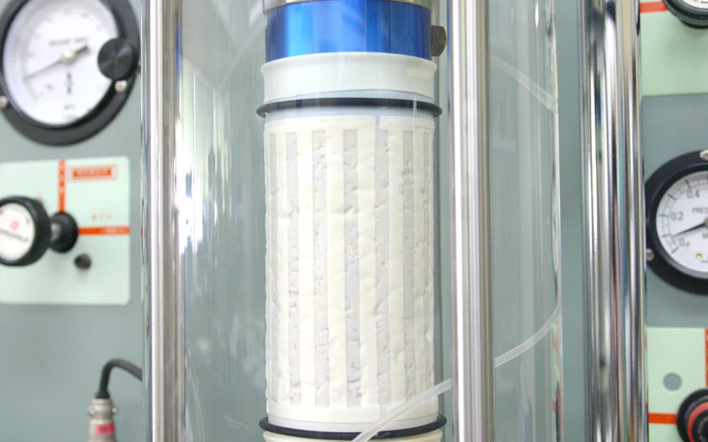 供試体体積が変化しないように配慮しながら、配管と供試体に通水し、炭酸ガスを脱気水に置き換えます。炭酸ガスの気泡が残らないように、供試体の下端から上端へゆっくり通水させて気泡を追い出します。上端からは配管を通じて水槽へ排水されます。