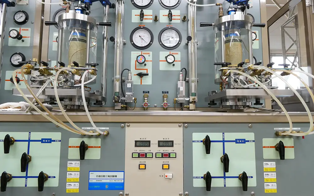 この装置では自動制御で軸圧縮を行い、土がせん断され破壊に至るまでを自動計測します。土をせん断する際の試験条件は複数あります。試験条件によって土の挙動は変化しますし、同一の土試料であっても試験結果は試験条件によって異なります。