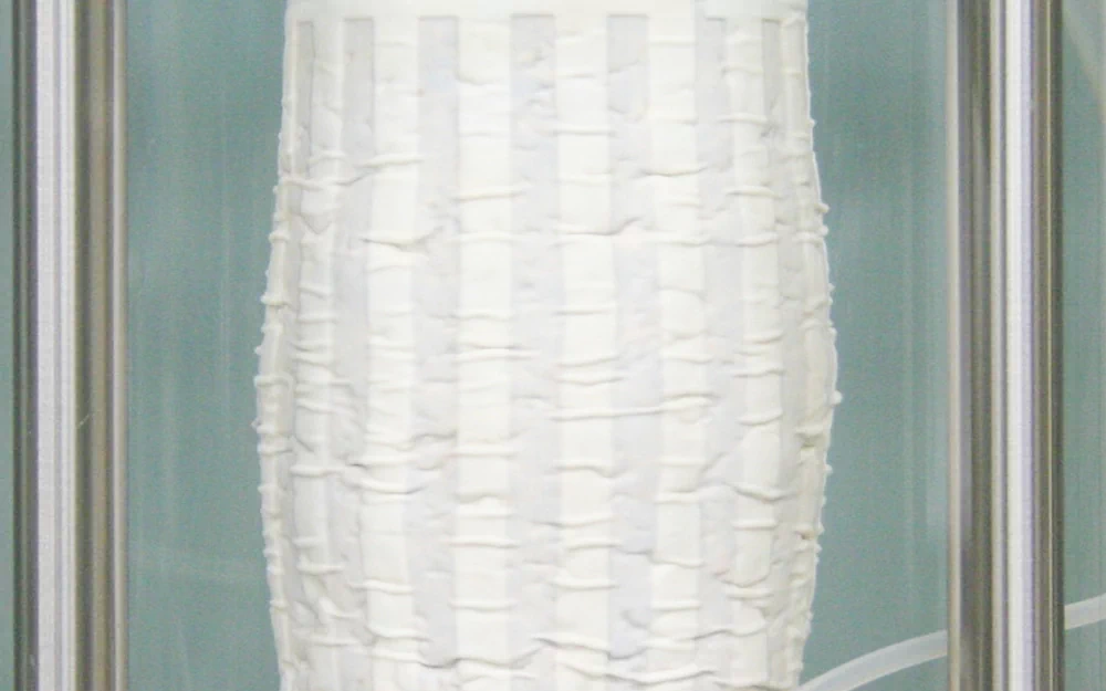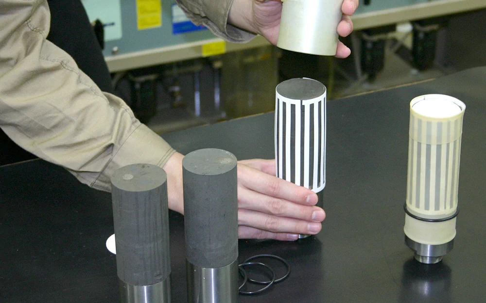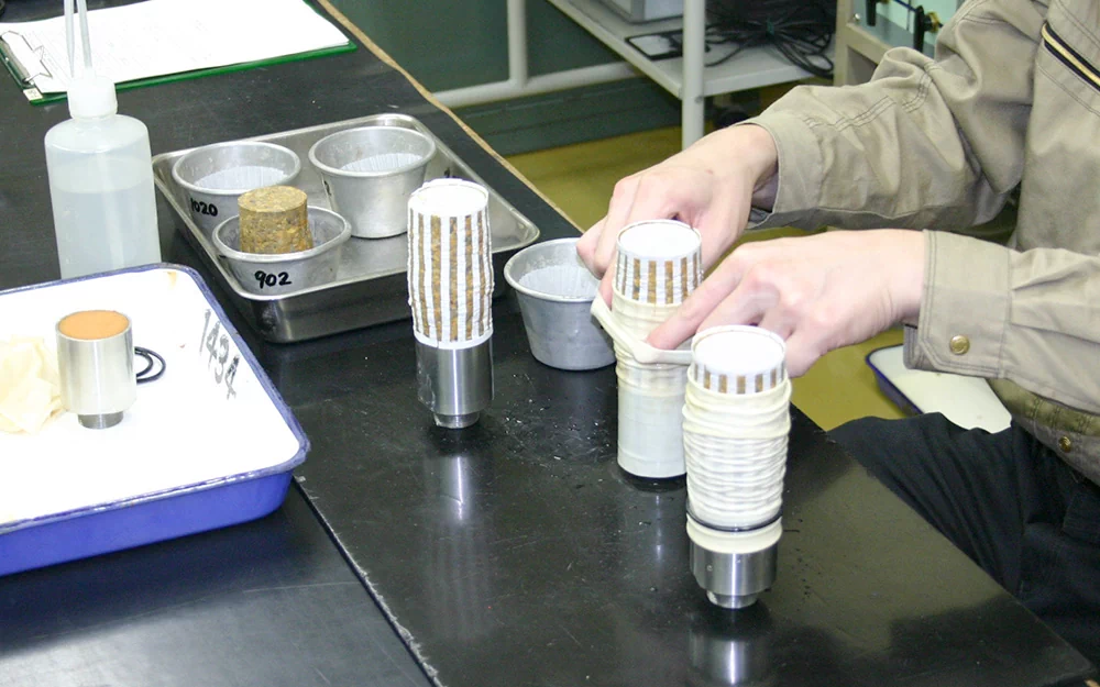 土の吸排水効率を上げるため、供試体側方にろ紙を添えます。ゴムスリーブで覆い、密封します。供試体を三軸圧力室(セル)に設置します。ゴムスリーブは厳選されたラテックス製のものを使用しています。