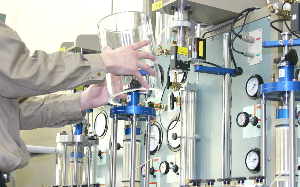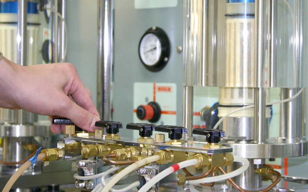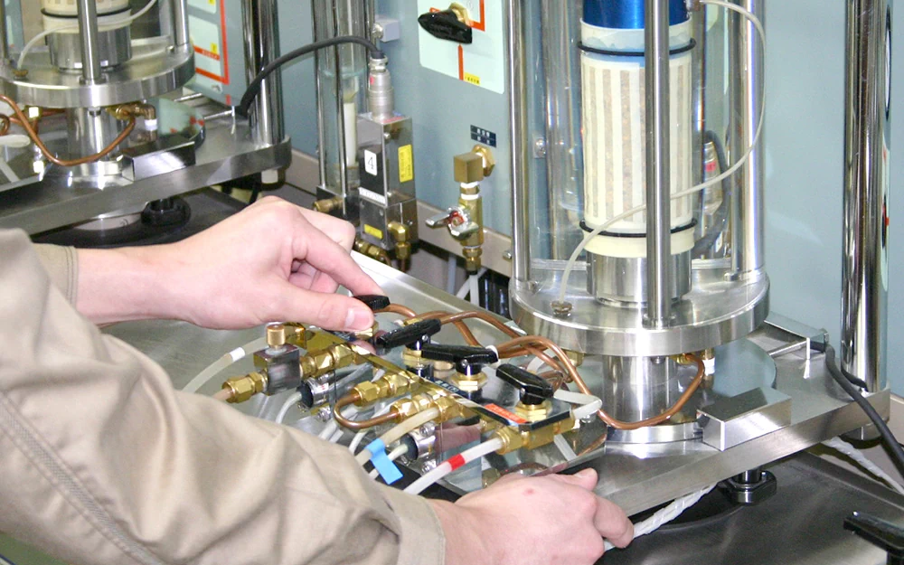 炭酸ガスを供試体下部から上部へ通気させて、ドライセッティングされた配管および供試体内部の空気をすべて炭酸ガスに置き換えます。CUbar条件などの間隙水圧を計測する試験では、供試体の飽和が試験の重要な前提条件となります。炭酸ガスが大気より重く、水に溶けやすい性質を利用して後工程での背圧の効果をより高めます。