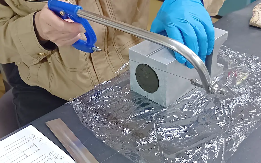 現場にてシンウォールサンプリング等により乱れの少ない状態の試料を採取します。高さ110~120mm程度に切断して保管し、状態の良い部分を試験試料とします。通常は1試料につき3~4供試体で試験します。