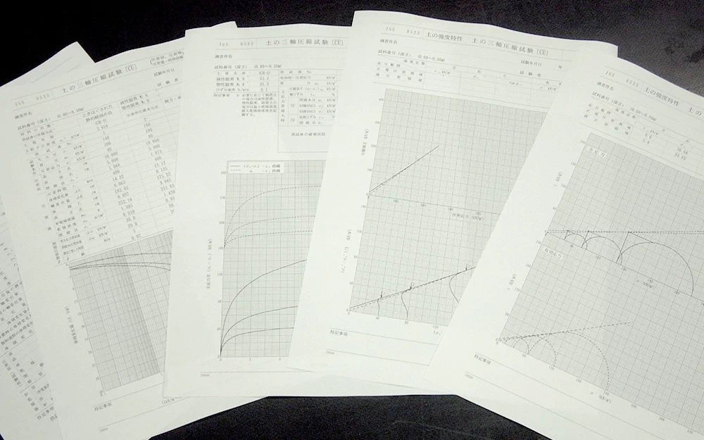 各過程の計測データを整理してデータシートにまとめます。データシートには結果となる地盤定数だけでなく、結果に至る過程の数値やグラフにもその土試料特有の様々な特徴が表れていますので存分にご活用ください。