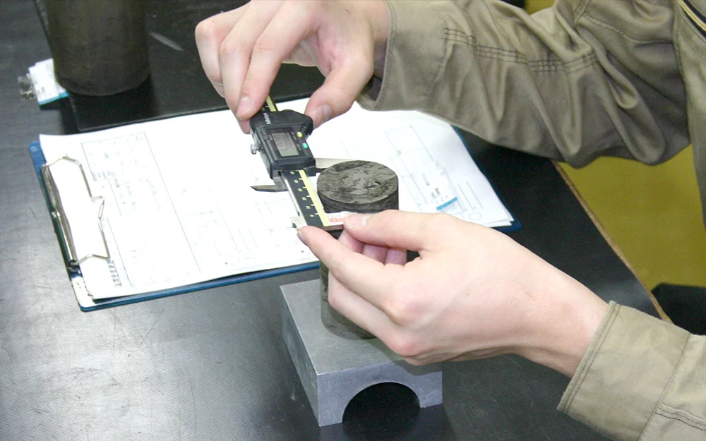 湿潤密度を測定します。電子天秤で質量を測定します。ノギスで直交する2方向の直径を上・中・下で計6回測定します。高さは円周を等分した3箇所で測定します。測定から得られる湿潤密度・含水比・間隙比等の状態量は、試験位置の土層を把握するための重要な要素です。
